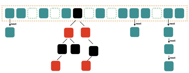- 第二种是和HashMap非常类似的拉链法结构,在每一个槽中会首先填入第一个节点,但是后续如果计算出相同的Hash值们就用链表的形式往后进行延伸