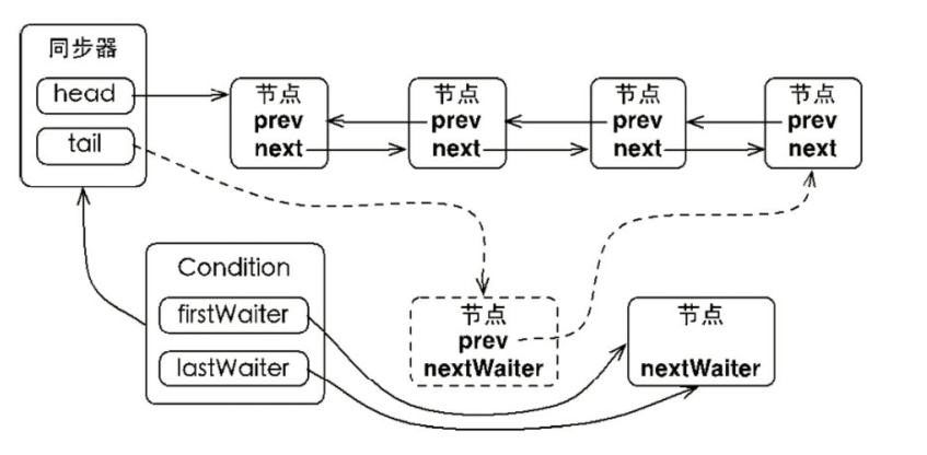- 一个Condition包含一个等待队列,Condition拥有首节点和尾节点。
